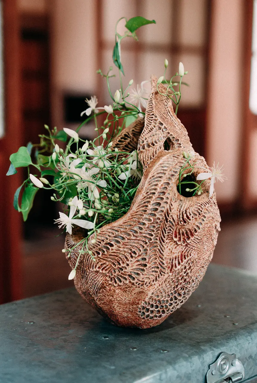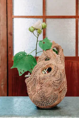 奈良氏制作の花器「Bone Flower」に特別に花をいける誌上コラボレーションを展開する。